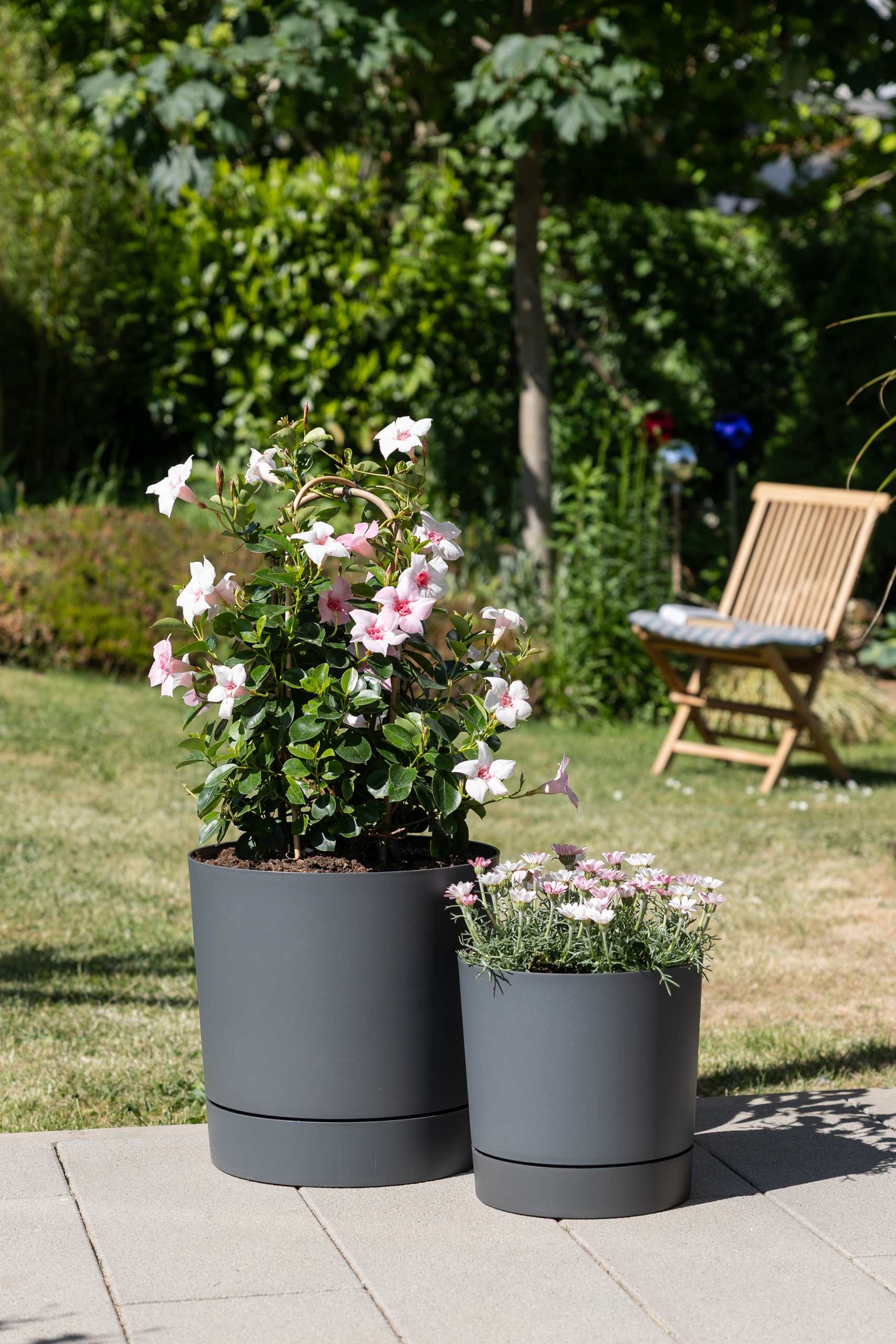 Die Leichtigkeit und die kompakte Kombination aus Pflanzgefäß und Untersetzer ermöglichen es, je nach Saison, unkompliziert für den passenden Standort von Mandevilla (Dipladenia), Kapkörbchen „Polarstern“, Schneeflockenblume (Sutera cordata) und anderen Pflanzen zu sorgen.