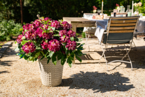Dreifarbiger Rhododendron im Kübel sorgt für Glücksgefühle auf Balkon und Terrasse